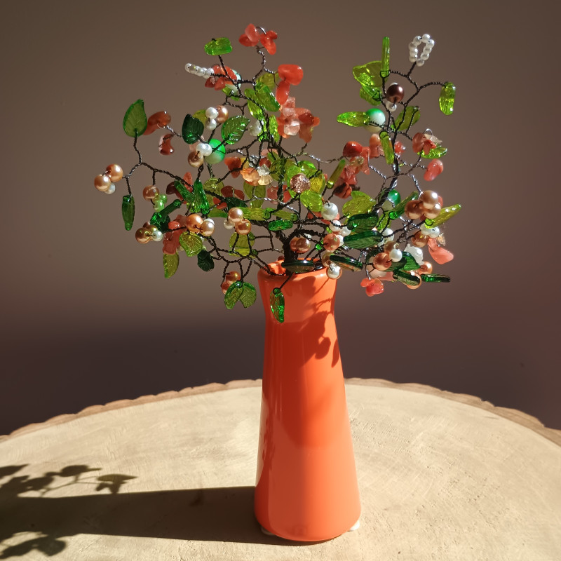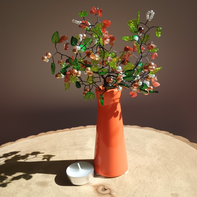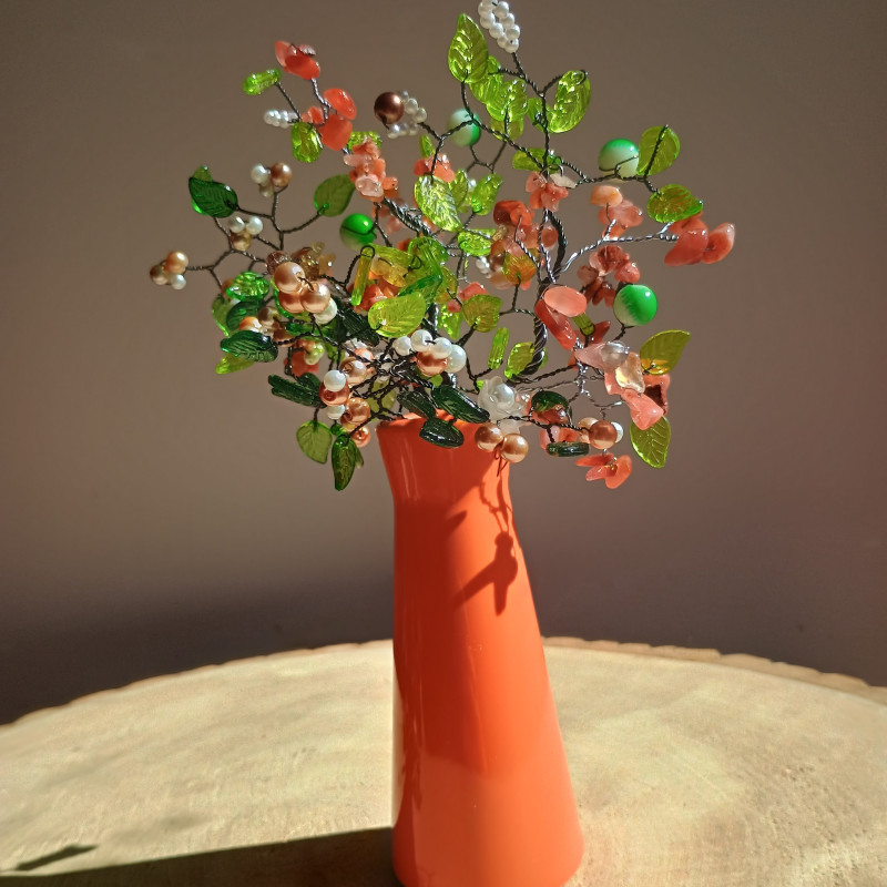 Květina je drátovaná z minerálů, voskovaných perlí, broušených českých korálků a akrylových lístků, které krásně rozzáří prostor díky blyštivému efektu.